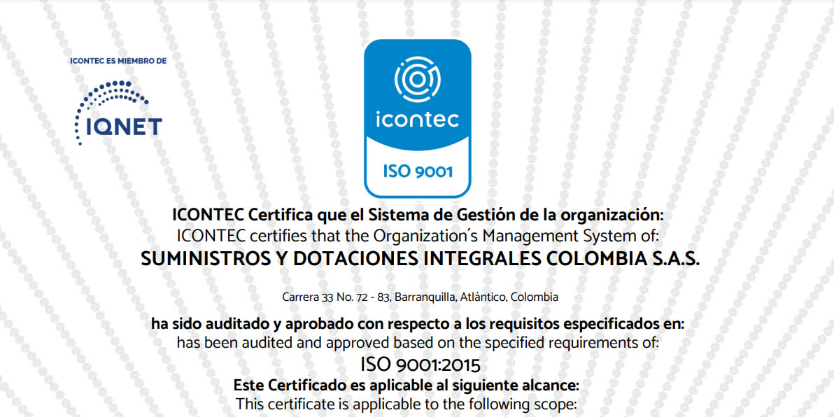 Comercializar y distribuir productos y equipos para: seguridad industrial, artículos de protección personal, equipos y accesorios para redes eléctricas, sistemas contra incendios, calzado y botas de dotación. Confecciones de ropa de trabajo y uniformes corporativos, artículos y equipos de aseo institucional, productos biodegradables para remediación de hidrocarburos y controles de derrames, señalización industrial y vial. Equipos y artículos para rescate en brigadas de emergencia con el objetivo de satisfacer de manera integral todas las necesidades y requerimientos de nuestros clientes en los sectores industrial, corporativo, institucional, construcción, alimentos, agrícola, minero, energético, telecomunicaciones, vigilancia privada, cooperativas entre otros. Garantizando así la excelencia de nuestros productos y servicios con la calidad y certificación exigida, operando con flexibilidad y dinamismo soportados por el talento humano de nuestro equipo de profesionales comprometidos a ofrecer soluciones integrales a nuestros clientes. Conozca Nuestros Productos